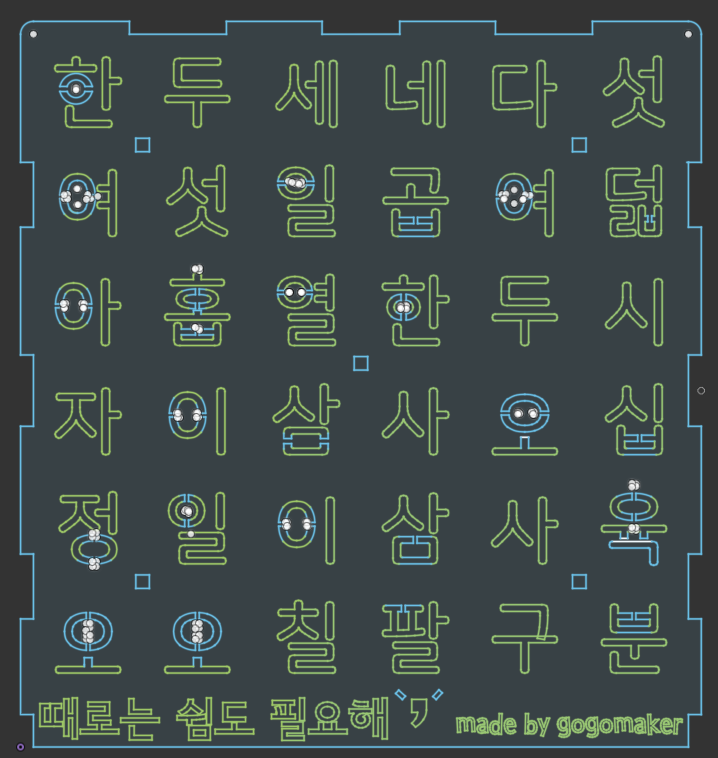 한글시계 판 바깥은 외부 케이스와 조립된다는 느낌을 주기 위해(결속되기 위해) 지그재그로 설계하였고, 중간중간에 있는 사각형의 경우, 뒤의 판과 결합하기 위한 구멍입니다(가장 밑에서 참고)